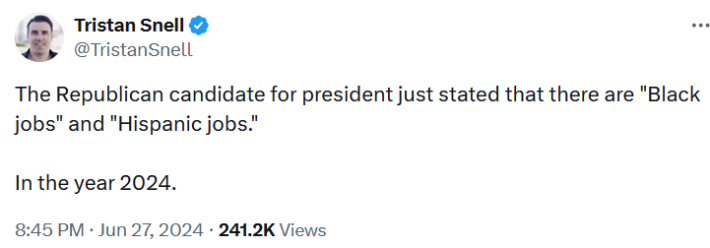 As much as President Joe Biden appeared to struggle through the 2024 debate, he didn’t say anything nearly as absurd as Donald Trump’s remarks about racially coded professional positions.