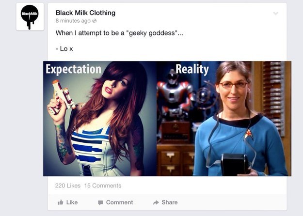 Being a geek girl isn’t easy when you’re constantly dealing with sexism, harassment, and “fake geek girl” accusations at every turn. So when you find a company that supports geek girls and encourages you to express your nerdy nature, you start to look at them as a positive example of what you’d like to see more of in geek culture. Unfortunately for many women who looked to online fandom fashion retailer Black Milk Clothing as this example, the company’s positive image was shattered when on Star Wars Day the company shared a rather disconcerting meme on Facebook.