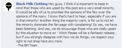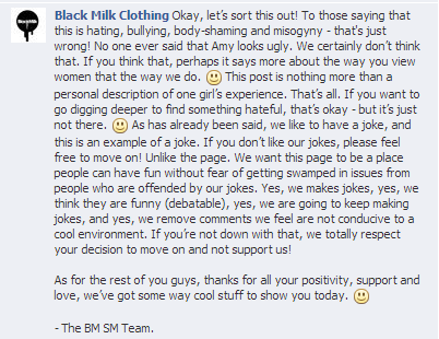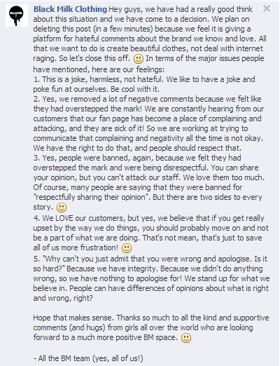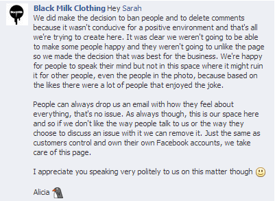 While sharing the meme was poor judgement on the part of the Black Milk team member who might not have understood how it would come across, it was really the company’s response to those who felt offended that made the situation worse. Those who shared their distaste for the meme had their comments deleted and some were banned from the page. Black Milk also answered comments with a poor attitude, telling those who felt insulted they should just leave the page and never purchase their products again.