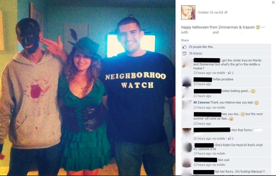 A Tumblr post about the Trayvon costume, decrying not only the use of blackface but also the cruelty of playing a murdered teen as a Halloween joke, has more than 12,000 notes. The post names the costumed teens and reveals the girl’s workplace. Twitter users claim they’ve already started bombarding the business with phone calls and Facebook messages.