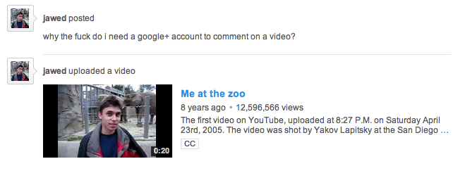 High profile YouTubers like AlphaOmegaSin have created videos condemning the change. A Change.org petition imploring Google to rollback the feature has collected 134,000 digital signatures. And a day after the changes were made, Jawed Karim, who founded the video hosting site with Chad Hurley and Steven Chen in 2005, spoke out against Google+ in his first YouTube comment in eight years.