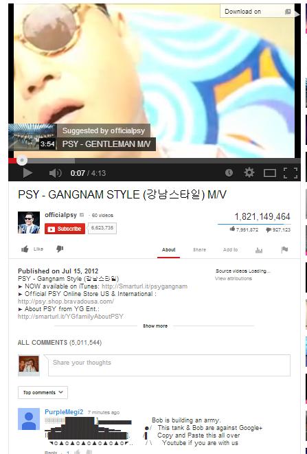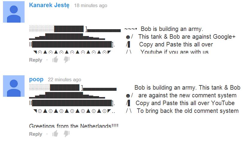 “Bob is building an army,” the caption reads. “This tank and Bob are against Google+. Copy and paste this all over YouTube if you are with us.”