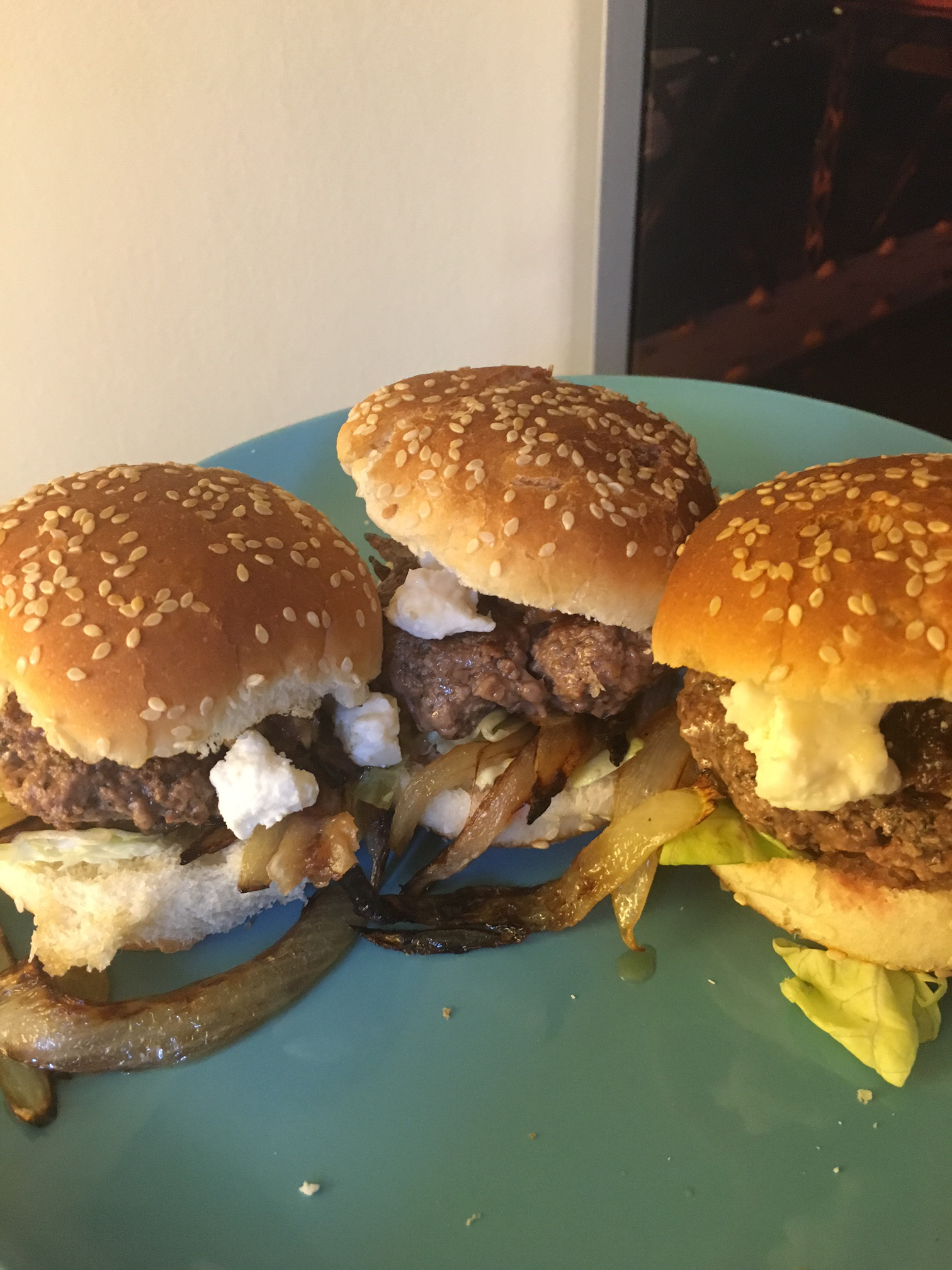 My largest flaw was impatience. This burger requires you to caramelize your onions, which the recipe suggests takes a good 20 minutes but I, hungry and bored, fell short of by at least 10 minutes before I decided my onions were good enough to eat. My Honeymaker burger was an easy prep on a pan stovetop, and I used the same onion pan for my meat to make sure it infused with flavor. Construction was sloppy, as the feta cheese I had didn't want to stay balanced on the bun, and once I took a bite everything came spilling out.