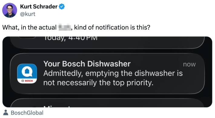 “Testing the limits of our patience”: Bosch 500 dishwasher’s “sassy” notification has the internet debating smart appliances