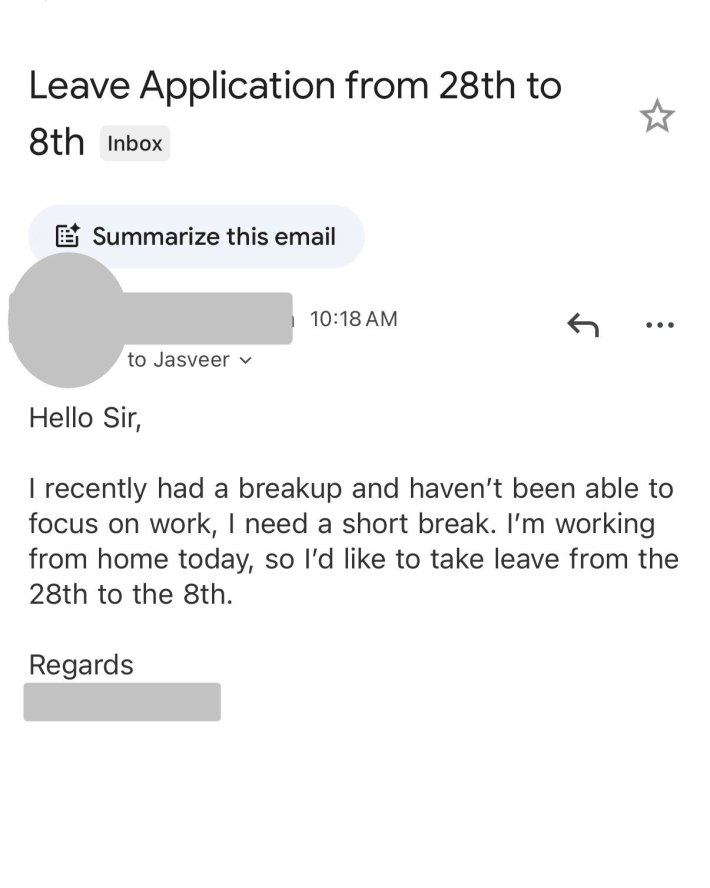 "Hello Sir, I recently had a breakup and haven't been able to focus on work," the email reads. "I need a short break. I'm working from home today, so I'd like to take a leave from the 28th to the 8th."