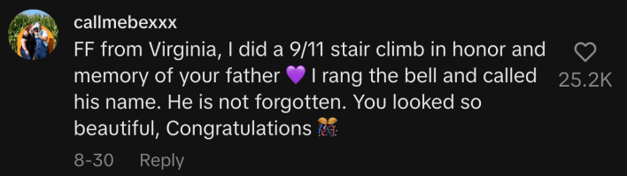 “FF from Virginia, I did a 9/11 stair climb in honor and memory of your father 💜 I rang the bell and called his name. He is not forgotten. You looked so beautiful, Congratulations 🎊.”