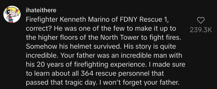 “Firefighter Kenneth Marino of FDNY Rescue 1, correct? He was one of the few to make it up to the higher floors of the North Tower to fight fires. Somehow, his helmet survived. His story is quite incredible. Your father was an incredible man with his 20 years of firefighting experience. I made sure to learn about all 364 rescue personnel that passed that tragic day. I won’t forget your father.”