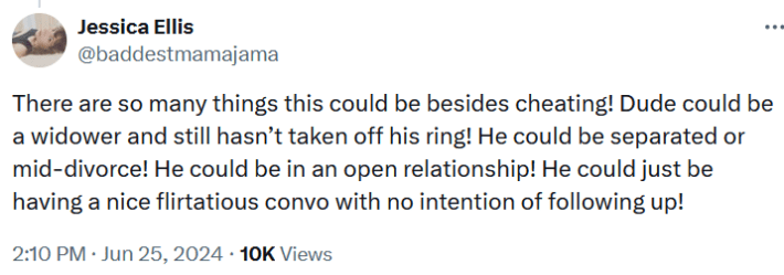 "There are so many things this could be besides cheating!" said filmmaker Jessica Ellis. "Dude could be a widower and still hasn’t taken off his ring! He could be separated or mid-divorce! He could be in an open relationship! He could just be having a nice flirtatious convo with no intention of following up!"