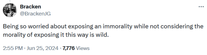 "I cannot imagine being this in somebody else's business," he wrote. "I simply cannot imagine using the vast machinery of the internet to address a moral wrong that has nothing to do with me at all."