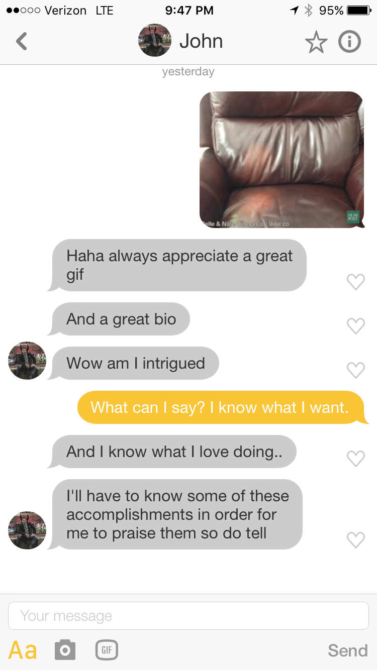 Kaytmaz wound up getting 50 matches in one day after changing her bio, but not every guy was into it. “Some men immediately started talking about their great oral skills instead of asking what accomplishments they should be praising me for. Some men just stopped talking after I would tell them an accomplishment.” However, the men who did ask her about her accomplishments were mostly quality, and she has a date lined up for this week.