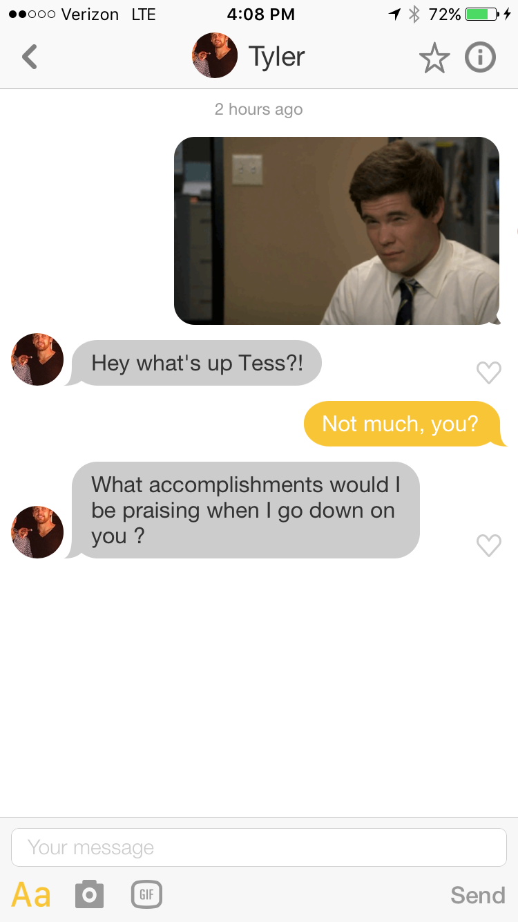 Digital Strategist Tess Kaytmaz was fed up with matches who only commented on her looks and barely read her profile, which she described to the Daily Dot as “basic information about me and my dog.” Then, her comedian friend Jamie Loftus (who once sold Shrek nudes for Planned Parenthood) posted a joking Facebook status: “Go down on me while praising my accomplishments in detail and we'll talk about a second date."