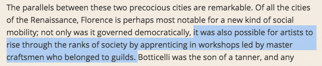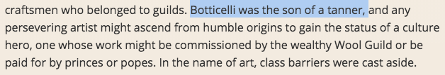 He’s not the only one like this, either! Both Brunelleschi’s and Leonardo’s fathers were notaries—a relatively minor position in the legal profession. Fra Filippo Lippi's father was a butcher; and Fra Bartolomeo's father was whatever a "muleteer" is. (See Richard Goldthwaite's book The Economy of Renaissance Florence, p. 350 for the a longer list of artists whose family professions were in entirely different fields.) But this doesn't necessarily prove that being an artist was a means of social advancement. It may have been a means of economic advancement for some talented people, though.