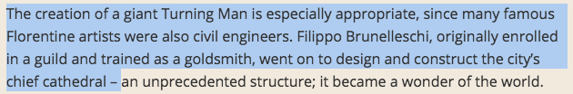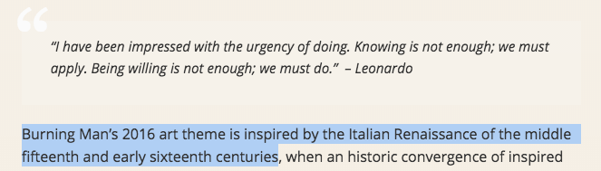 One immediately shows oneself  to be unknowledgeable about the Italian Renaissance when one refers to Leonardo as "da Vinci." Vinci is a town in Tuscany, ergo "da Vinci" means "from Vinci." It is not a family name. "Da Vinci" refers to anyone from Vinci. Even if it was a family name, it could refer as well to Leonardo’s nephew, a sculptor named Pierino da Vinci who died in his early twenties. However, to Burning Man’s credit, for the rest of the introduction, they refer to him correctly as Leonardo.