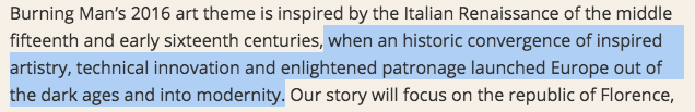 Florence was an artistic center in the 1300s and remained an artistic center well into the 1600s. I'm guessing Burning Man is trying to refer to what is sometimes considered to be the golden age of the Medici family, whom they extol in the rest of the intro. However, in that case, their time frame is too broad. I also wonder if Burning Man knows that its history has included the period in which a fire-and-brimstone-type preacher named Savonarola spoke vigorously against the wealth that the Medici family were accumulating and inspired a mass uprising in which they were exiled. Savonarola, it must be said, was not at all a fan of art.