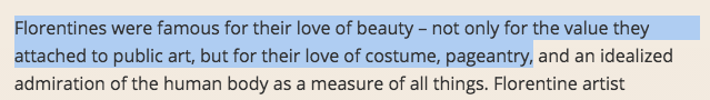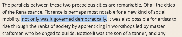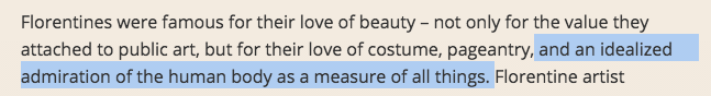 Certainly the elites were interested in humanist ideals, but how much did the citizens care? Saying that Florence cared about humanism is deeply misleading unless you also acknowledge that it was a deeply religious city as well.