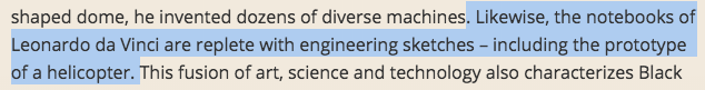 This drawing is of a flying machine and it looks really cool and amazing for its time, but calling it the prototype of a helicopter is a giving a lot of credit to Leonardo. Again, contextualization would be nice.