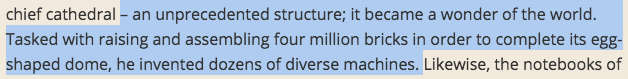 Also,  Brunelleschi did not "design and construct" the Duomo— he just made the dome. This was no small task, as it was the largest dome in Christendom and he made it without using scaffolding. It took nearly four centuries for art historians to learn just how Brunelleschi was able to do this. What is equally amazing, if also a little puzzling, is that for more than 100 years the Florentines were building their cathedral knowing that it was too large to put a dome over it, but trusting that they would figure out the science when it came time to build it.