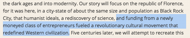 Since the real history of Renaissance Florence of this time is, in part, the story of the Medici family—a massive accumulation of wealth, material objects and political power, the family’s overthrow, return, overthrow again, return again, dismantling of the Republican system, and continued accumulation of material wealth as, for centuries, Florence's clout in world politics slowly diminished until the dynasty fell ignominiously and the family died out in the eighteenth century—the tech elite who frequent Burning Man might see the story as a bit precautionary.