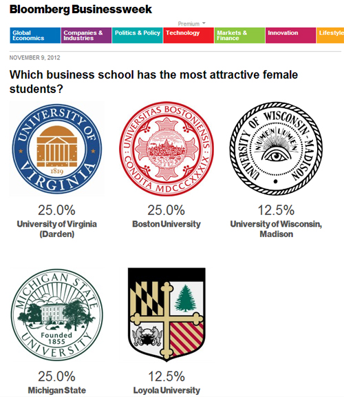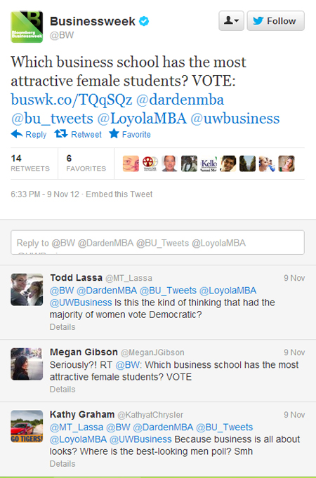 This year, however, coming just after an election season full of heated debate over the “war on women,” Businessweek’s decision to promote their survey with a headline and a tweet asking “Which business school has the most attractive female students?” went over about as well as you’d expect.