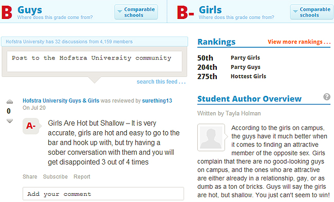 College Prowler does provide information on academics, scholarships, and other collegiate issues; but it also lets students rank colleges by factors like “hot girls.”