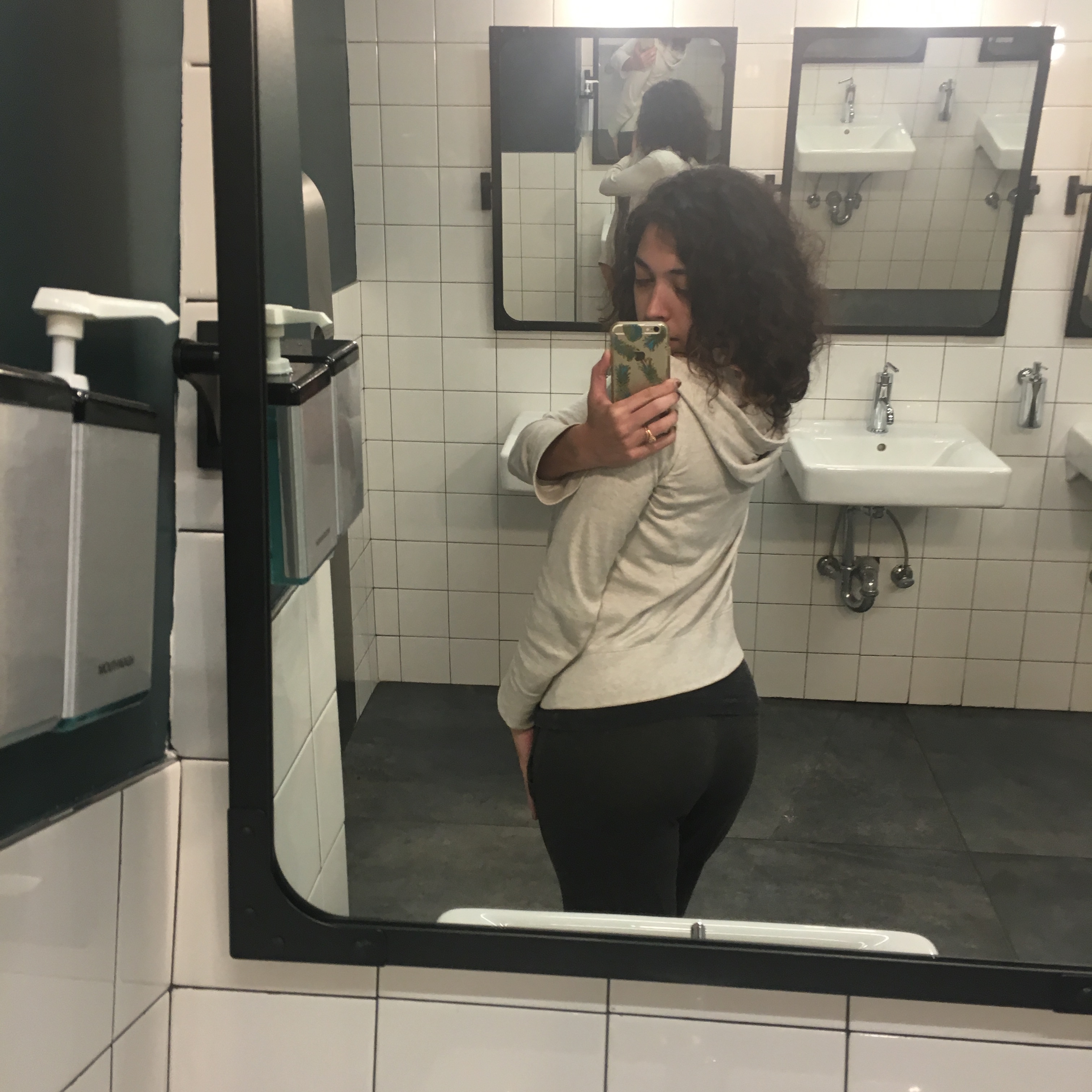 Unfortunately, I have neither Celestial Bodiez leggings nor current access to a full-length mirror. What I do have are some $10 H&M sweatpants, a perfectly fine butt, and the bathroom mirror in a shared workspace, which shows most of my body but also leaves me open to anyone who works on this floor seeing me take butt selfies during work hours. But this is journalism, dammit.