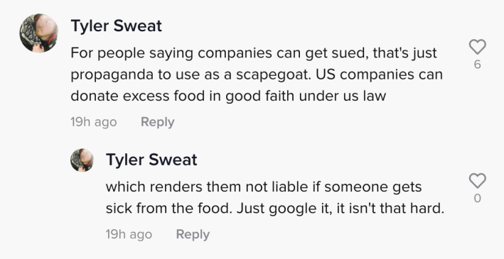 “For people saying companies can get sued, that’s just propaganda to use as a scapegoat,” one user commented. “U.S. companies can donate excess food in good faith under U.S. law.”