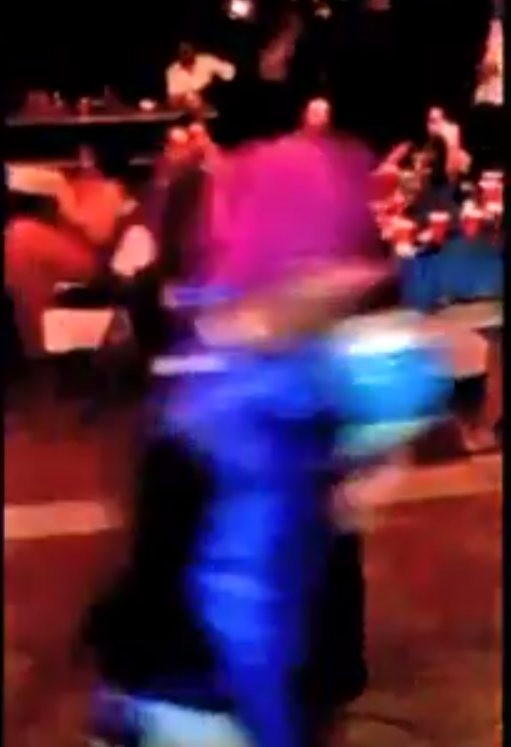 Not long after, everyone’s attention seems to skew toward the garishly dressed intruder, and as we lose visibility, a single gunshot can be heard. The band continues to play for a moment, but another burst of rapid gunfire creates mass panic. Screams and the crash of plates and silverware ring out. Warning: It’s a disturbing clip, despite the absence of graphic imagery.