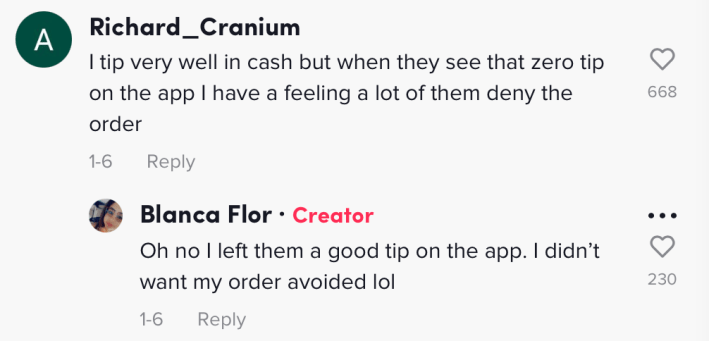 "I tip very well in cash but when they see that zero tip on the app I have a feeling a lot of them deny the order," the commenter wrote.