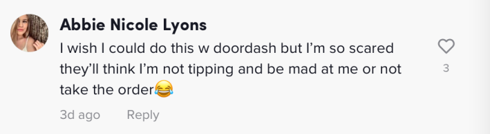 "I wish I could do this (with) DoorDash but I'm so scared they'll think I'm not tipping and be mad at me or not take the order," they wrote.