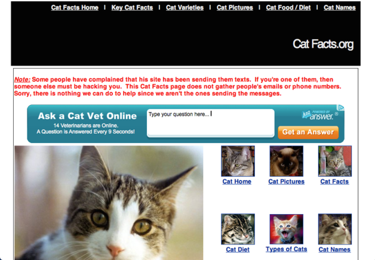 Markham’s only regret is that she might have contributed to the death of CatFacts.org. “I imagine that it was run by little old cat ladies. Right after [the Cat Facts prank] went viral they put a disclaimer on their…vfront page,” Markham said.
