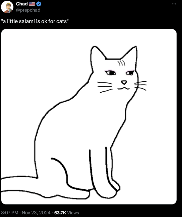 The Catjak appeared in late November 2024 among a high volume of new Wojak characters. The smiling feline quickly became Wifejak's new adopted family member.