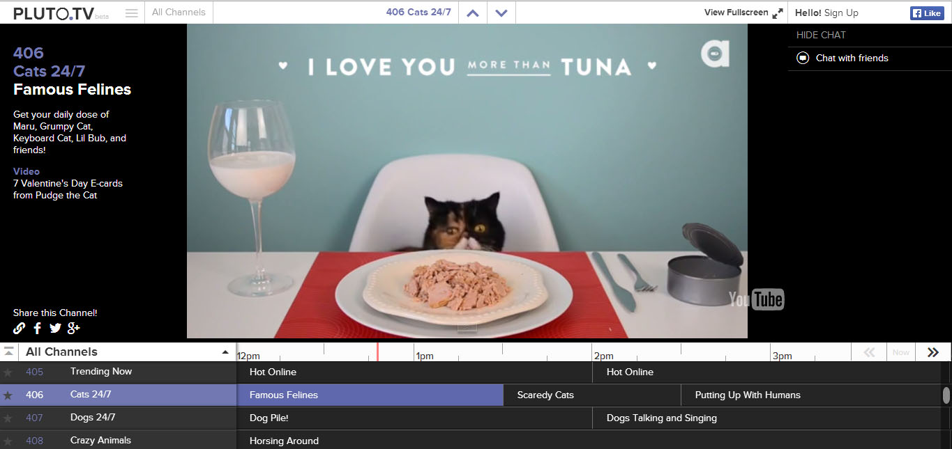Back in the old days (you know, before 2005), watching cats on TV wasn't so easy. You had to wait for one to be featured on the local news or a sitcom. On Saturday mornings, you might get lucky and catch an episode of Thundercats or Garfield and Friends. And if you were really lucky, you were watching TV at a time when Milo and Otis was in heavy rotation on cable. So the cat-lover in you should be eternally grateful for Channel 406 on Pluto.TV.