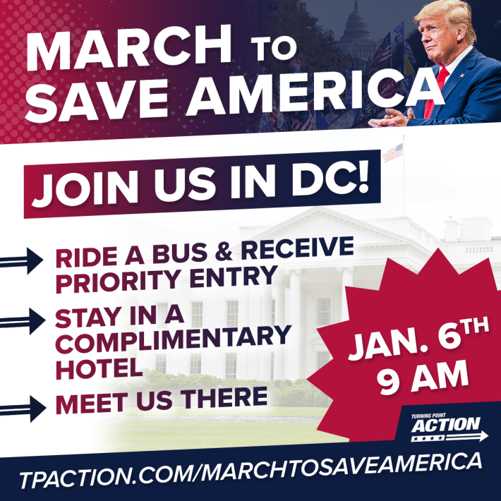 The website for Turning Point Action (TPA), an offshoot organization of TPUSA, earlier in the week openly advertised the campaign, offering both bus rides and complimentary hotel rooms to those willing to come to D.C.