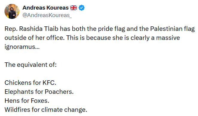 "Some of these protesters hold up signs proclaiming 'gays for Gaza,'" he said. "They might as well hold up signs saying 'Chickens for KFC.'"