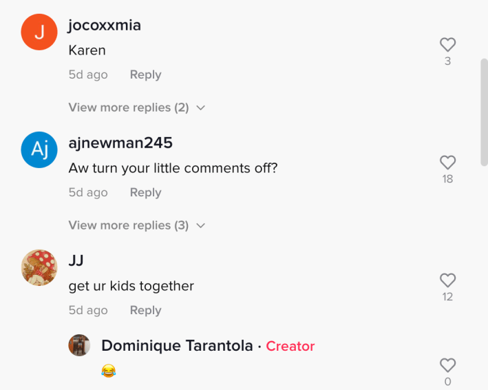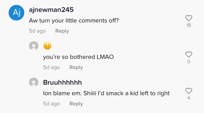 Comments on the video itself have been turned off, but people have gone to various other videos on her account to let her know how they feel about it.