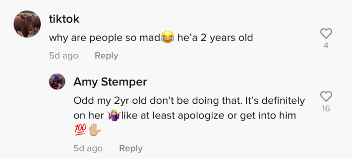 "Odd my two-year-old don't be doing that," one commenter wrote. "It's definitely on her. Like at least apologize or get into him."