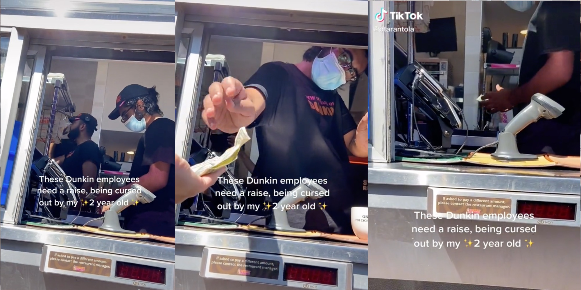 "These Dunkin' employees need a raise, being cursed out by my two year old," text overlay on the video reads.