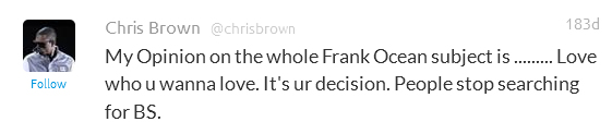 Brown later deleted his conciliatory tweet, however, and last year rumors surfaced of homophobic comments Brown made about Ocean after his much-publicized coming-out. Brown denied them, and stated via Twitter, "Love who u wanna love." (That tweet, too, was later deleted.)