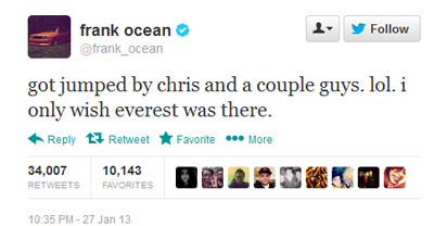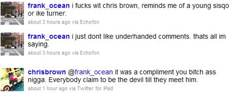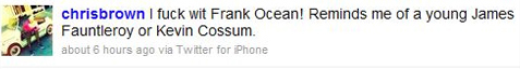 In summer 2011, Brown sent a seemingly innocuous shout-out to rapper Frank Ocean, then primarily known as one of the members of alt-hip-hop group Odd Future. Brown called Ocean "a young James Fauntleroy or Kevin Cossum [sic]." Many onlookers, including The Globe's Sarah Pickett, thought it was "kind of a funny diss."