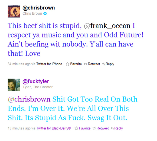 A few days later, Ocean posted a video of two of Chris's cousins chasing him down after a run-in. The video prompted Odd Future's Tyler, the Creator to express worry for the safety of everyone involved. Then Brown supposedly backed off: