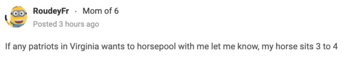 "If any patriots in Virginia want to horsepool with me let me know, my horse sits 3 to 4," RoudeyFr said.