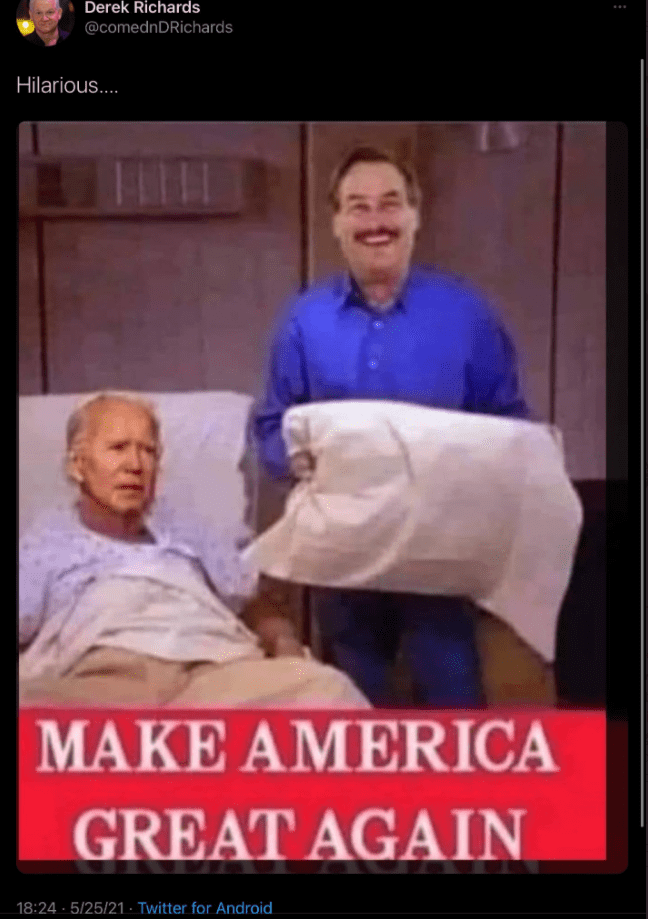 In one, Richards posted a photoshopped meme of Mike Lindell holding a pillow next to President Joe Biden in a hospital bed. The meme is captioned, "Make America great again," former President Donald Trump's 2016 campaign slogan.