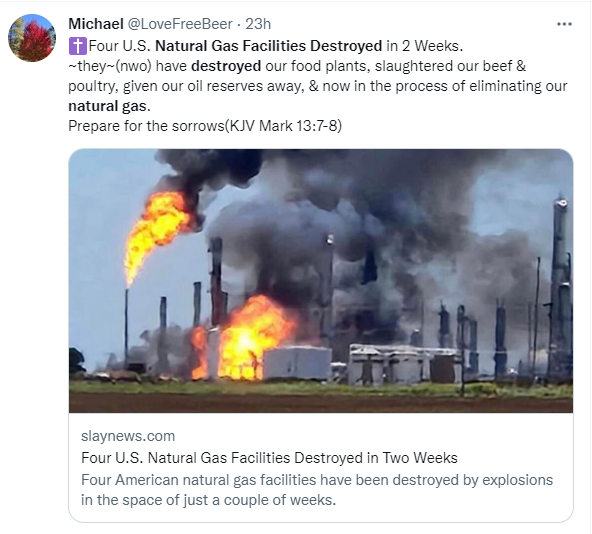 Similarly dystopian and alarmist claims based on false information about exploding natural gas facilities popped up elsewhere.