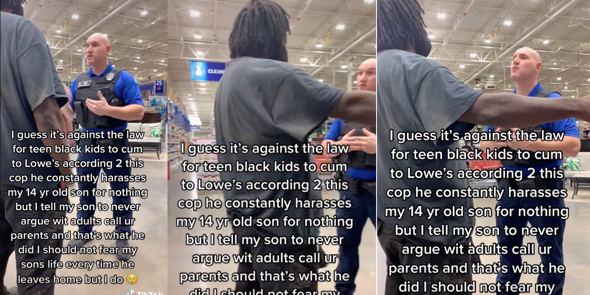 The video is captioned, "I guess it's against the law for teen black kids to [come] to Lowe's according to this cop. he constantly harasses my 14 yr old for nothing but I tell my son to never argue with adults call your parents and that's what he did. I should not fear my sons life every time he leaves home but I do."