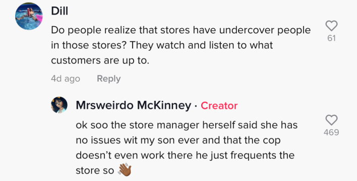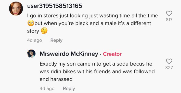 She wrote that her son had been riding his bike in the area with some friends, and that they had come into the store to purchase a beverage. It's not clear when she and his father came to the store to figure out what was happening. In a follow-up video, she asks someone who she claims is a manager if there were any issues with her son at the store, to which the manager replies, "no."