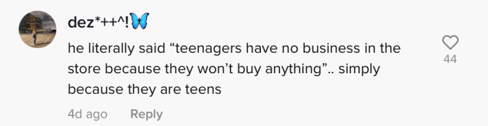 Some commenters expressed frustration with the situation, saying that people browsing in a store is nothing new, and taking issue with the way the police officer in the video phrased his objection to the poster's son being in the store, saying that teens shouldn't be in a store because they "won't buy anything."