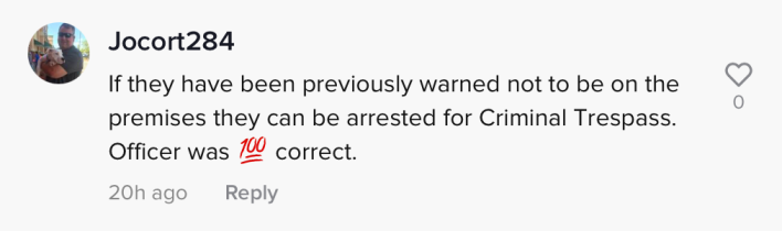 "If they have been previously warned not to be on the premises they can be arrested for Criminal Trespass," one commenter wrote. "Officer was 100 correct."