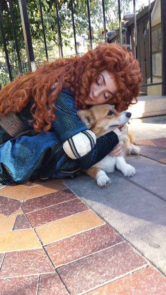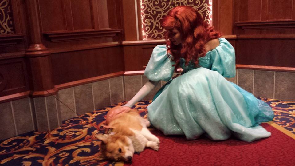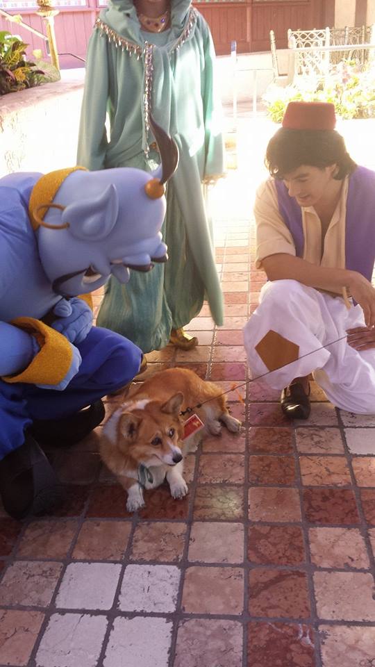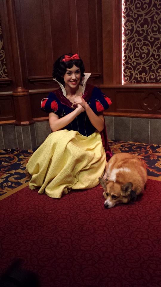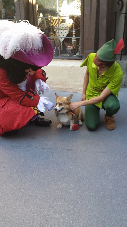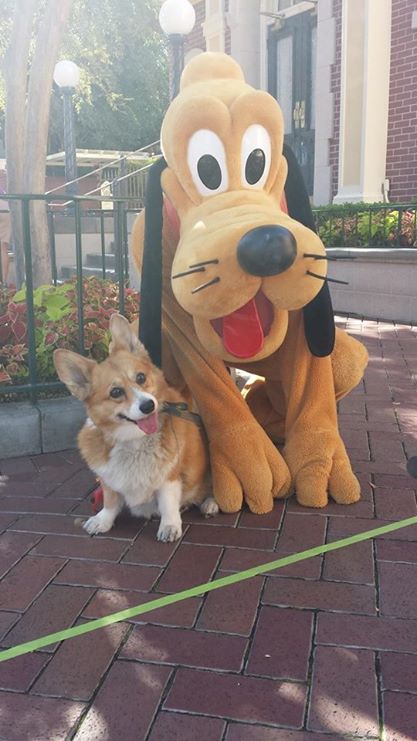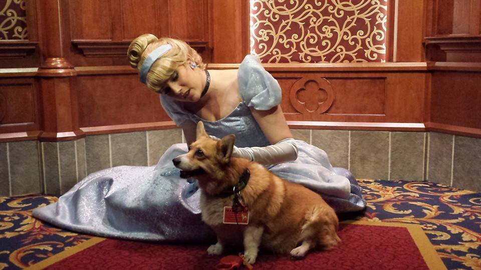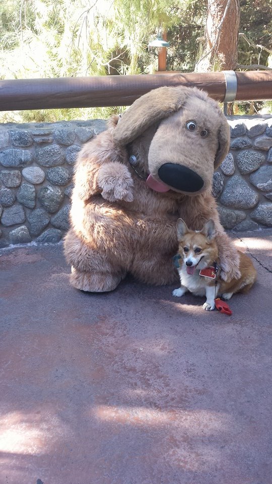 A corgi! But not just any corgi, one lucky enough to take a visit to the happiest place on earth and be photographed alongside some of her favorite characters.