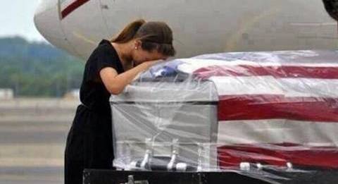 The real woman in the photo is Ashley Edens. Edens’s husband, U.S. Army Specialist Jason Edens, was killed last year while serving in Afghanistan. The photo, taken by an Army photographer, shows Edens receiving her husband’s body in Tennessee.