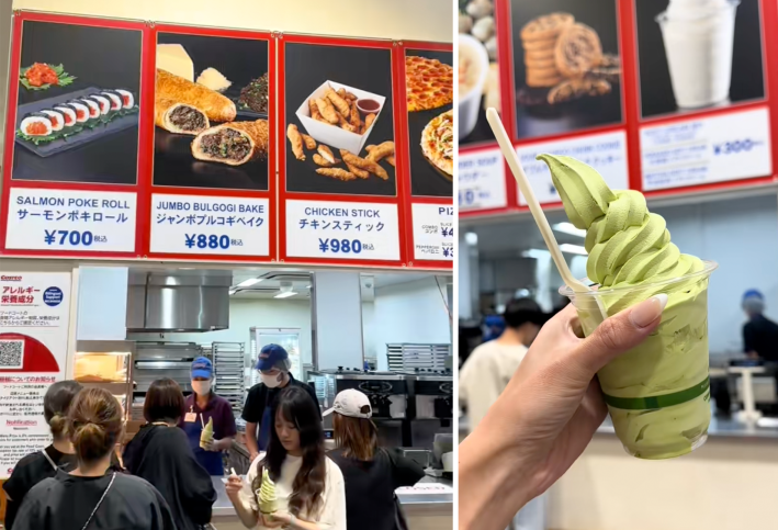 We see menu boards advertising Jumbo Bulgogi Bake, crispy chicken sticks, and the ever-famous Costco hot dog. Then she zooms in on a physical menu with even more options, including a Salmon Poke Roll, melon smoothie, and Hokkaido soft-serve.